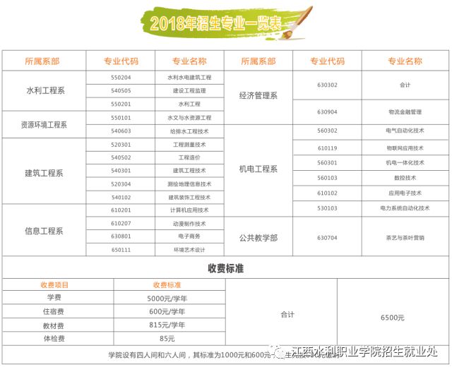 学院简介 江西水利职业学院是经江西省人民政府批准设立、国家教育部备案的公办全日制普通高等职业院校。始建于1956年(前身是江西水利电力学院),座落于江西会英雄城南昌,隶属江西省水利厅,交通便利,距离地铁一号线起点(双港站)仅1500米。 学院师资力量雄厚。现有教师390余人,其中高级职称46人,博士6人,硕士172人,拥有多位全国优秀教师、 全国水利职教名师,并引进大批具有丰富实践经验的技术能手到学院授课。校园环境优美,教学设施完备, 校园无线网络覆盖,学生公寓全部安装有空调、热水器。 学院高度重视学生的创新创业教育和就业推荐工作,郑重承诺为每一位毕业生推荐优秀的工作岗位。 学院荣誉 招生专业一览表 水利工程系 水利水电建筑工程 本专业主要面向水利工企业,河道管理部门和基层水利勘测、设计、运行管理等单位,培养从事水利水电工程勘测设计、施工、水利工程建设监理、水工建筑物检测、检修及维护、河道整治、防洪抢险等工作的高级技术技能型人才。 水利工程 本专业主要面向地方基层水利部门和水利建设与管理市政给排水工程、城市防洪工程建设、城镇水务管理、乡镇供水工程,农田灌排水工程、其他建筑工企事业单位等,培养从事城市水利工程、农田灌溉排水工程、乡镇供水工程以及相关工程的勘测、规划、设计、管理、监理等工作的高级技术技能型人才。 建设工程监理 本专业主要面向水利、房屋建筑、交通、桥梁等工程施工和监理企业培养具有工程施工监理综合职业能力,能够从事建筑行业中设计、施工、管理、预算、监理等工作的高级技术技能型人才。 资源环境工程系 水文与水资源 本专业主要面向水利、建筑、能源、交通、农林、环境保护等部门从事水文、水资源及环境保护方面的勘测、一般工程规划设计、信息采集及处理、水旱灾害预测及防治、分析计算、水政水资源管理等第一线工作的高级技术技能人才。 给排水工程技术 本专业主要面向城市规划部门、各级环保部门、设计单位、施工单位从事城市给水排水、消防给水工程建筑、水污染控制以及室内建筑给排水工程的规划、设计、施工和技术管理等岗位工作人员。尤其注重培养能从事给水排水施工与运行管理领域的高级技术技能型人才。 建筑工程系 工程测量技术 本专业主要面向测绘企业、工程施工企业,培养符合水利、建筑、道路、桥梁等工程施工方面的工程测量工作岗位要求,掌握测量基本理论和基本技能,能从事各种工程测量、地籍测量等工作的高级技术技能型人才。 本专业确保赣、闽、浙100%专业对口就业。 工程造价 本专业主要面向建筑施工、造价咨询企事业单位,培养符合建筑工程概预算、建筑工程结算审计等工作岗位要求,掌握建筑工程预算、工程量清单计价实务、造价系列软件应用等基本理论和基本技能,能从事建筑施工预算、造价事务招投标、工程结算审计等工作的高级技术技能型人才。 建筑工程技术 本专业主要面向建筑施工企业,建筑工程监理企业、建筑工程管理单位等企事业单位,培养符合建筑工程施工、测量放线、工程预算等工作岗位要求,掌握建筑工程施工、工程测量等基本理论和基本技能,能从事建筑工程施工测量放线等工作的高级技术技能型人才。 测绘地理信息技术 主要面向地理科学及信息科学领域,培养具备地理信息系统与地图学的知识与技能,能在城市、区域、资源、环境、交通、人口、住房、土地、甚础设施和规划管理等领域工作的高级技术技能型人才。 本专业确保赣、闽、浙100%专业对口就业。 建筑装饰工程技术 本专业主要面向装饰施工管理、建筑装饰设计、建筑装饰工程施工、建筑装饰预算或工程监理等岗位要求。培养具有建筑装饰相关基础理论和基本技能,具有一定的审美和设计能力,具有建筑装饰施工图设计、建筑装饰工程施工、建筑装饰工程组织与管理等能力,能从事建筑装饰设计、装饰施工技术与管理、建筑装饰工程监理的高级技术技型人才。 信息工程系 计算机应用技术 主要面向IT行业、互联网开发行业,培养具有较强动手能力的实用型人才。掌握扎实的计算机应用技术知识和Web实践技能,能在企事业单位从事基于互联网开发、应用等相关工作的高级技术技能型人才。 动漫制作技术 本专业培养掌握动漫制作技术专业知识,手工绘画与计算机绘画的美学原理与设计技能,二维动画与三维动运动规律和空间思维,影视特效制作与动漫游戏制作的高级技术技能型人才。 电子商务 本专业培养熟悉商业互联网行业技术,扎实掌握电子商务的行业知识,营销策划知识,网络推广知识,具备从事全电子商务网络平台的开发、维护、运营及推广能力,具有创新精神,创业意识和能力的高级技术技能型人才。 环境艺术设计 本专业培养掌握环境艺术设计专业知识,设计方法和设计技能,,能在环境艺术设计机构从事室内外环境艺术设计,公共空间设计,城市环境景观与社区环境景观设计、园林景观没计等工作的高级技术技能型人才。 经济管理系 会计 本专业培养具备经济、管理,会计等方面的专业基础知识,掌握会计基本理论和应用技能,具有较强实践能力,能在各类企事业单位和社会中介,机关团体从事财务会计实务工作的高级技术技能型人才。 物流金融管理 本专业面向物流
